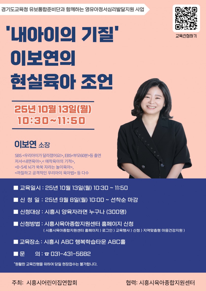 "내 아이의 기질" 이보연의 현실육아 조언 강연 페이지 정보 작성자 깨알육아 댓글 0건 조회 9회 작성일 25-10-11 17:53 목록 본문 경기도 교육청 유보통합준비단과 시흥시 어린이집 연합회가 함꼐하는 영유아 정서심리발달 지원사업의 일환으로 이보연 소장의 강연이 진행됩니다. 많은 관심 부탁드립니다. 다음글KBS2 TV유치원 - 이보연소장 자문 25.09.09